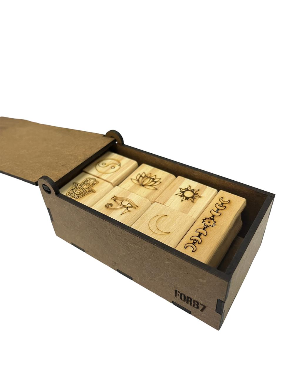 2,5×2,5 cm / 1cm acrílico Gravação de 5mm (6 unidades)5,0×1,0 cm / 1cm acrílico Gravação de 5mm (1 unidade) Caixa:11x6x4 cm Feito em MDF